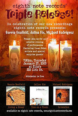 When Eighth Note Records got behind my CD. Time on a Chain, I found a supportive family that welcomed a variety of skills from its members - not only the musical ones. I felt as if I was given free reign to not just design the look of my CD, but the label's logo, press brochures, sample CDs, and the look of the CD release party (right down to the party giveaways). By clicking on the below press brochures you can unfold them to see the interior or reverse sides. |